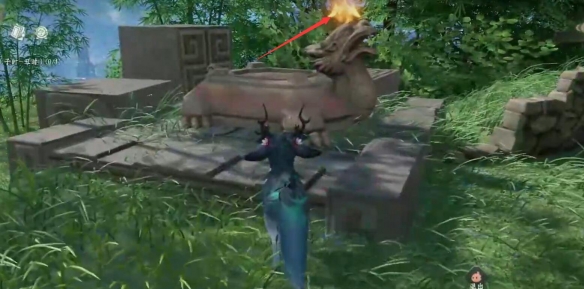 5、去水中的平台,碰云携头上的火,然后来到图示位置,把火球放进去;