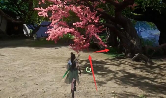7、沿着楼梯下去左转走到桃花那里,然后前往桃花下的楼梯。