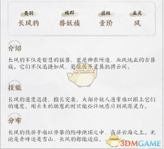 在仙剑世界当中存在着很多非常有趣的精怪,小编也是为玩家们整理了仙剑世界精怪图鉴,玩家们可以参考了解游戏当中所有的精怪然后在游戏当中进行游玩互动,感兴趣的小伙伴千万别错过。那么下面就让小编带着大家来看看长风豹详细介绍,希望能够帮助到大家。
