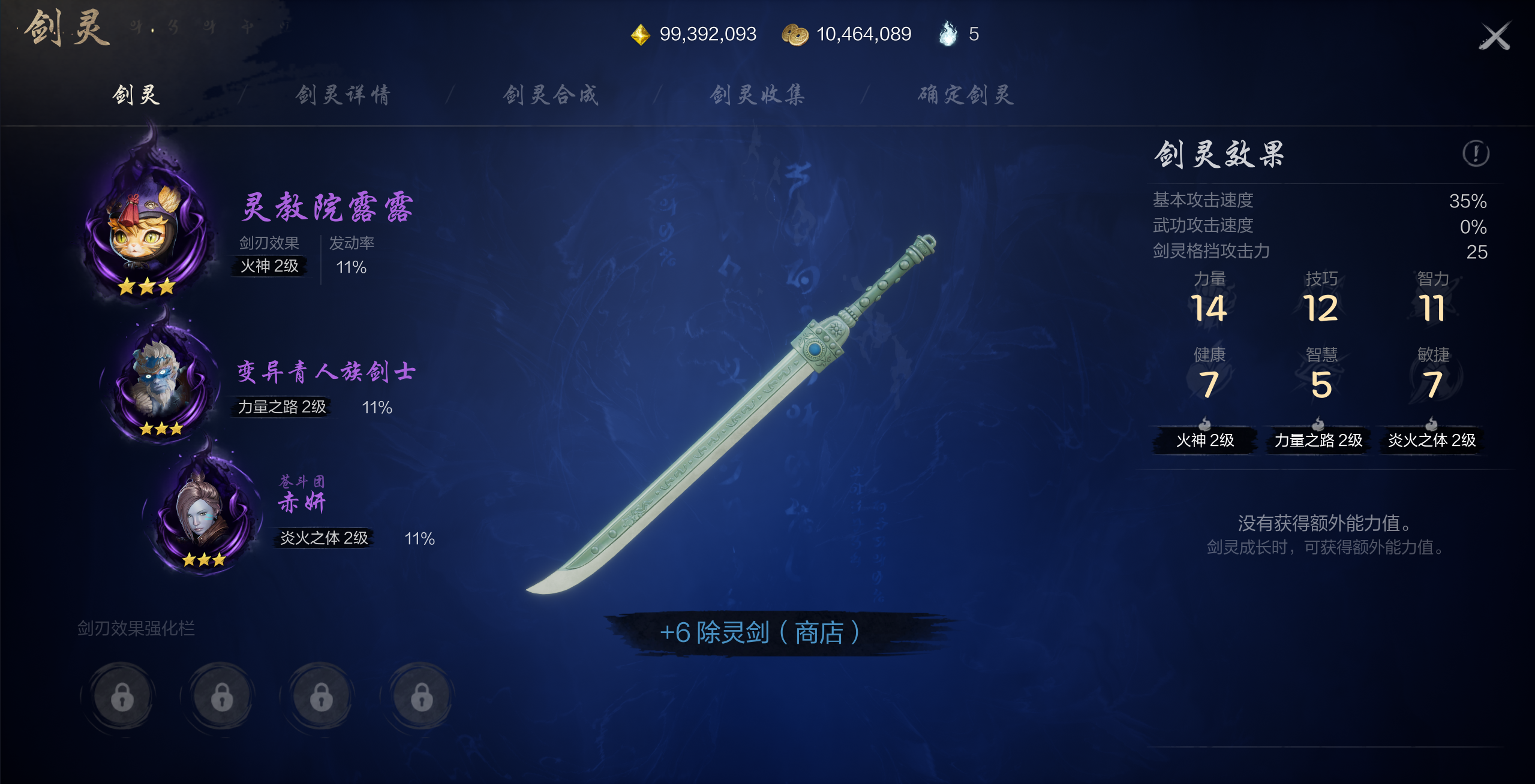 主剑灵:灵教院露露副剑灵:变异青人族剑士+赤研剑刃效果:火神+力量之路+炎火之体可替换剑灵:月光疾风/若律(火神)、阐武团剑士/梅花团巡逻团员/夜灵王/冬虫(力量之路)、赤猪老三/魄夜(炎火之体)后期可解锁剑刃效果强化栏,在剑刃强化栏中装备剑刃效果相同的剑灵也可以提升剑刃效果等级。剑灵阵容解析:此阵容中剑灵的品质均为稀有,较为容易获得,星级也比较容易提升,适合玩家作为前期过渡时的搭配。剑刃效果解析:【火神】在剑刃效果等级较低时可以提升武功攻击增幅,使剑各类武功所造成的伤害得到提升。随着剑刃效果等级的提升,剑刃效果还会追加怪物战斗攻击力、剑灵亲和力,并有概率造成额外伤害,使剑的输出能力得到进一步加强。【力量之路】可以造成相当于力量一定百分比的额外伤害,与剑的主属性非常契合,力量越高,所能造成的额外伤害也会随之提高。【炎火之体】在剑刃效果等级较低时就可大幅提升无视防御伤害及暴击率,使剑的爆发输出能力得到大幅提升。随着剑刃效果等级的提升,剑刃效果还会追加移动速度提升率、暴击额外攻击力等多个增益,使剑的各项输出能力都得到加强,从而打出更加极致的输出。