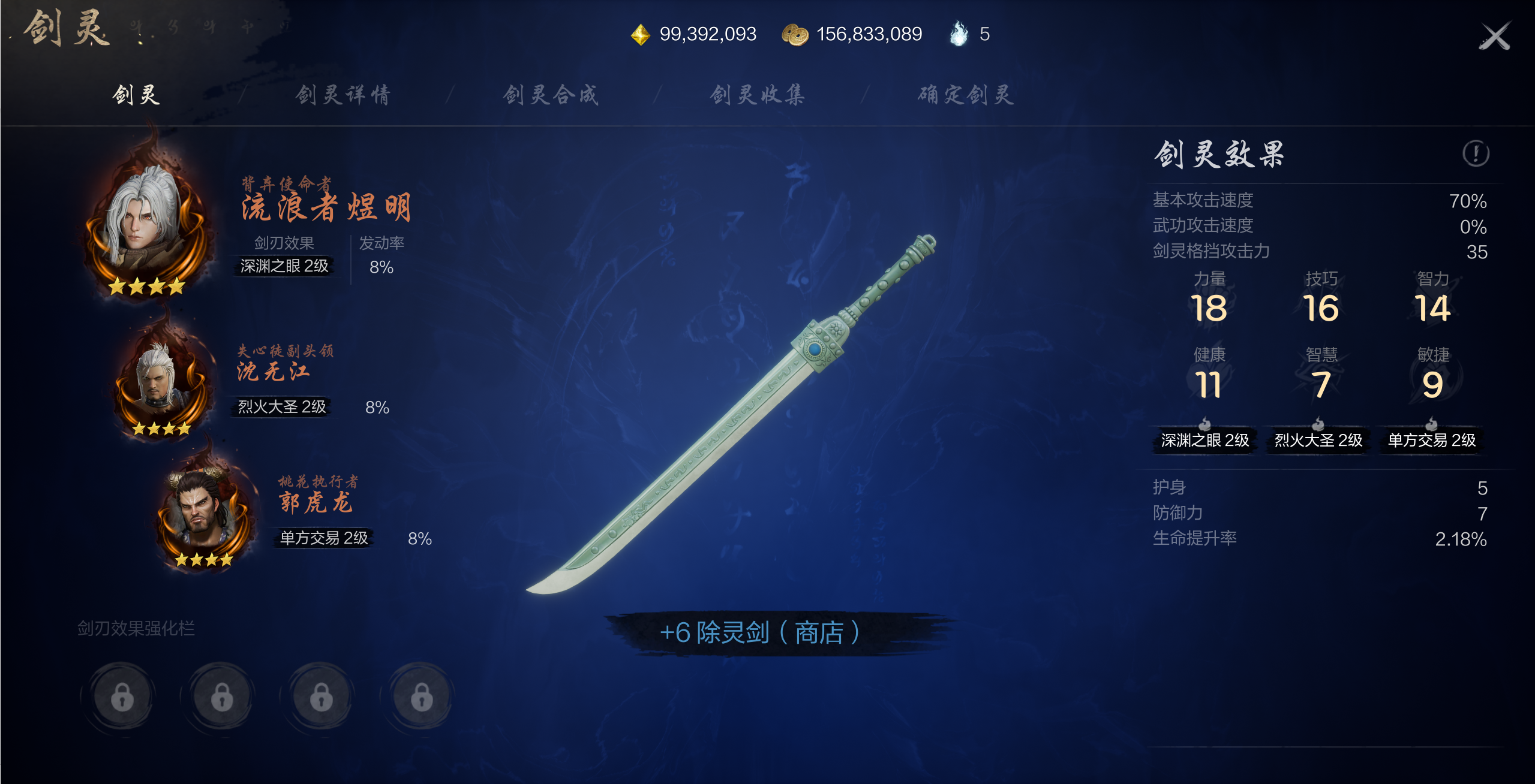 主剑灵:流浪者煜明副剑灵:沈无江+郭虎龙剑刃效果:深渊之眼+烈火大圣+单方交易可替换剑灵:风白门战斗组员/无名(深渊之眼)、明月/炎煌(烈火大圣)、明慧团研究员/青明派青衣斗士/青明派青衣战士(单方交易)剑灵阵容解析:此阵容中剑灵的品质均为至尊,玩家可以在游玩的过程中慢慢抽卡获得,推荐玩家每天完成侠行任务,如果条件允许还可以购买每周召唤券礼包,从中获得大量抽卡资源。剑刃效果解析:【深渊之眼】可直接减少对方一定百分比的生命值,随着剑刃效果等级的提升,剑刃效果还可造成范围伤害。【烈火大圣】也可直接减少对方一定百分比的生命值,同时还能减少目标闪避,配合【深渊之眼】剑刃效果,使剑的输出达到最大化。【单方交易】可对处于浮空、眩晕状态的目标造成巨额的额外伤害,同时有着极短的冷却时间,配合其他武器的控制效果,可以使剑发挥出惊人的伤害。