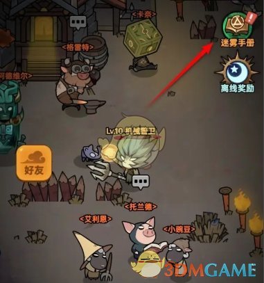 1、首先我们点击游戏主页右上角的迷雾手册前往;