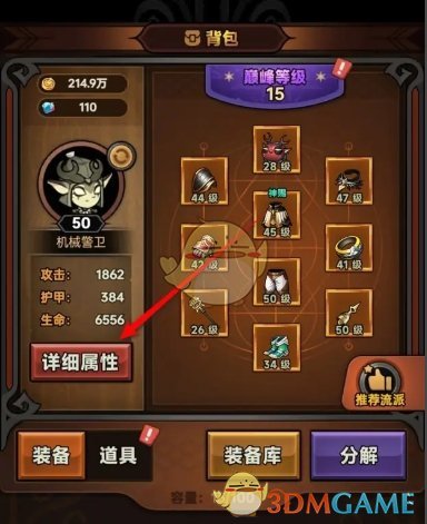 2、然后在背包页面,点击头像下方的详细属性选项;