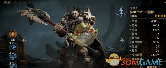 第2个推荐的是大酋长格里什纳尔,这个英雄的队长技能和厄尔丹是一样的,自身被动为获得20%伤害减免效果,自身施加的护盾受到来自敌方伤害时,有几率对伤害来源施加攻击降低状态,持续5秒钟,且施加该状态时无视其25%豁免。战技最重击伤害最高的友方目标施加队友保护和免疫控制这两个状态,持续10秒钟,该状态无法被移除。此后对自身和该目标施加持续10秒的护盾和二级防御增加状态。该技能在战斗开始时必定被释放,且该技能不需要施展动作。队友保护可以替目标承受一定伤害,二级防御增加能够附加60%防御属性,免疫控制就是使对方免疫所有的控制状态。