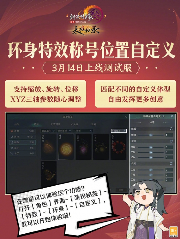 剑网3太极秘录将于3月14日开启首测,很多玩家想知道首测新增内容有什么,首轮测试将增加:大附魔剥离、背包分类与筛选、官方定制摄影棚、环身特效称号位置自定义功能,除此之外还会上线10人太极宫副本。接下来就由小编给大家带来了《剑网3》太极秘录首测新增内容一览!
