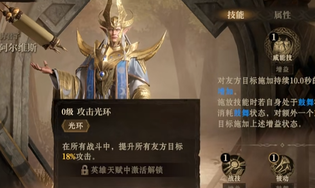 攻击光环:当友方目标成功触发重击或狂野判定时,阿尔维斯有50%的概率为其施加一层鼓舞状态,持续5秒。鼓舞状态可以增加目标20%的攻击力和10%的威能,极大地提升了队友的爆发能力。