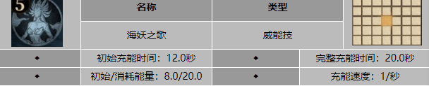 海妖之歌:多尔切蒂斯唱起歌谣,对所有友方目标施加持续回复状态和2级防御增加状态,持续10秒。同时有50%概率对所有敌方目标施加魅惑状态,持续5秒,并有75%概率减少所有敌方目标50%威能。持续回复状态能够持续回复生命值,2级防御增加状态能够增加60%的防御。魅惑效果下,敌人会进入混乱状态,随机攻击友方,降低威能则减少目标威能技充能进度,在短时间内事没有办法放技能的。