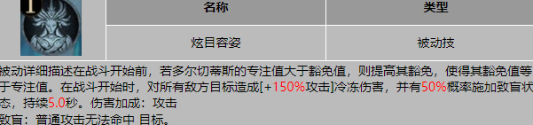 炫目容姿:在对战之前,如果本体的专注值大于豁免值,则提高其豁免值,使其等于专注值。战斗开始时,对所有敌方目标造成50%攻击的冷冻伤害,并有50%概率施加致盲状态,持续5秒。致盲状态下,敌人的普通攻击无法命中目标。这一技能不仅能在战斗开始时造成大量伤害,还能有效降低敌人的输出能力,为队伍创造优势。