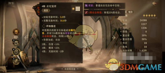 被动技能祖灵赐福对题方目标施加减益状态时有百分之三十几率移除一名随机友方目标身上的一个减益状态。该被动是需要配合自身的战技和威能技来使用,具有一定的净化能力。战技是圣光笼罩,对范围内的敌方目标造成光耀伤害,并有75%概率施加致盲状态和一级攻击降低状态,持续5秒钟。对方被致盲之后,普通攻击就无法命中目标,一级攻击降低效果可以降低对方25%的攻击力。威能技山脉之力,发动三次攻击,每次都能对范围内的敌方目标造成光耀伤害,有30%概率施加眩晕状态持续5秒钟。对方被眩晕之后就无法进行普通攻击和释放技能。