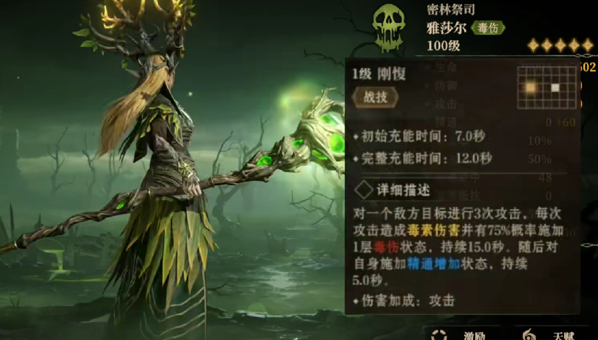 当然,毒属性阵营当中最强的输出角色是雅莎尔,她拥有极高的毒伤倍率,并且在对敌方目标进行三次攻击的期间,有75%的概率能够叠加毒伤,一旦叠加的层数达到五层,她可以直接处决敌人。
