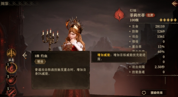 首先就是菲莉丝蒂,火系主C,狂野体系核心人物 ,核心的队长技能为“重击伤害光环”,能在所有战斗中提升队友的目标造成30%重击伤害。被动技 “灼血” 让普通攻击和战技触发重击时,增加自身5%威能。战技“焚毁”狂野发射火球,对敌方目标造成 (+300% 攻击) 火焰伤害,威能技“火羽”狂野发射火焰激光,对敌方目标造成三次(+370%攻击)火焰伤害,且伤害无视目标护盾。