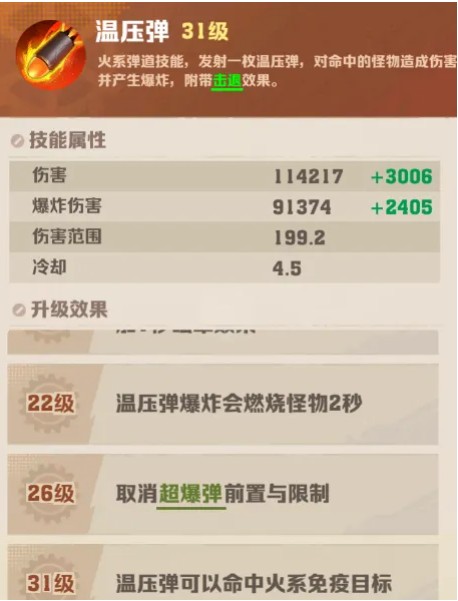 在31级之前,温压弹对火系免疫怪那是完全无效,但一旦升到31级,温压弹就能无视元素免疫,对火系免疫怪造成伤害。这对于推进高难度关卡来说,可是有很大帮助的。