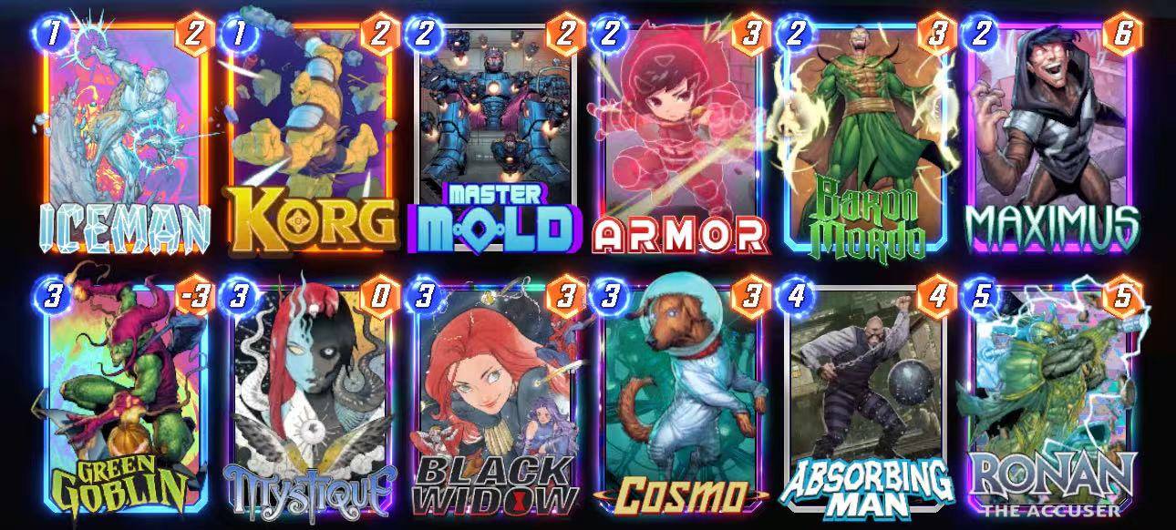 # (1) Iceman# (1) Korg# (2) Master Mold# (2) Armor# (2) Baron Mordo# (2) Maximus# (3) Green Goblin# (3) Mystique# (3) Black Widow# (3) Cosmo# (4) Absorbing Man# (5) Ronan the Accuser#QnJuTXJkQSxNc3RyTWxkQSxCbGNrV2R3QSxBYnNyYm5nTW5DLFJubjUsQXJtcjUsSWNtbjYsS3JnNCxNeG1zNyxHcm5HYmxuQixDc201LE1zdHE4##