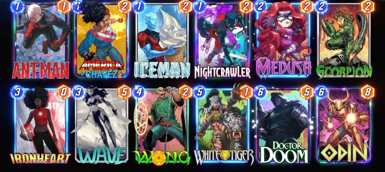 要使用此卡组,复制它到你的剪切板后,在MARVEL SNAP中打开卡组编辑界面进行粘贴。 核心卡牌:浪、毁灭博士、奥丁打法介绍:这套卡组曲线比较平滑,基本可以按费拍怪有啥拍啥,整体有两个路线,第一个路线是3回和拍浪、四回合毁灭博士、五回合白虎、第六回合奥丁,场上会有大量的衍生物,战力绝对不虚。第二个路线是第四回合王、第五回合白虎、第六回合毁灭或者奥丁。这两个combo能打出来都可以打出很高的战力,实战中可视情况调整即可。若核心牌在手尽量提前打出snap争取收益最大化。