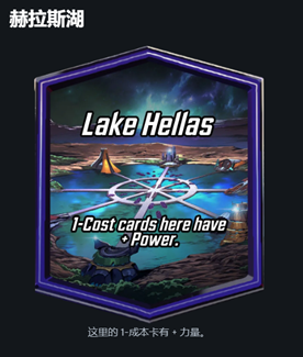 区域卡:代表不同的漫威场景,每个区域卡可以增强或减弱英雄卡的能力,或者提供某些特殊效果。如下图赫拉斯湖这个区域,能量消耗为1的卡牌可以额外增加2点战力,那么玩家就该在对战的时候尽量把1费卡打在该区域以获得更高的综合战力。