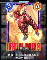 另外,作者在游玩的过程中发现很多卡牌的设计是非常有意思的,看过漫威电影的都知道钢铁侠本身是没有多少战斗力的,主要依靠强大的装甲来武装自己,那么游戏卡牌在设计的时候,也是结合了电影里的人物特征,给了钢铁侠这张牌0点的战力,和强大的区域翻倍战力的特殊能力。