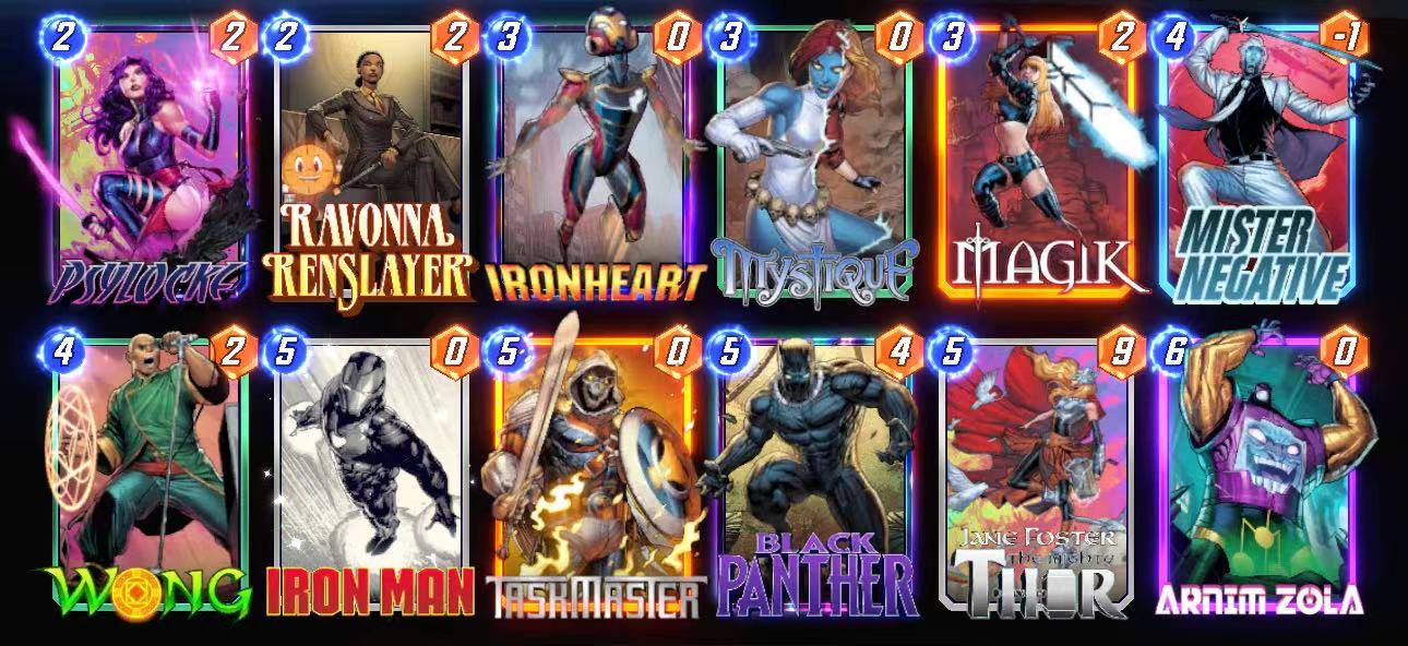 # (2) Psylocke# (2) Ravonna Renslayer# (3) Ironheart# (3) Mystique# (3) Magik# (4) Mister Negative# (4) Wong# (5) Iron Man# (5) Taskmaster# (5) Black Panther# (5) Jane Foster Mighty Thor# (6) Arnim Zola#UnZublJuc2xyMTAsV25nNCxQc2xjazgsSXJuaHJ0OSxNc3RxOCxNZ2s1LE1yTmd0dkEsSXJuTW43LFRza21zdHJBLEpuRnN0ckEsQXJubVpsOSxCbGNrUG50aHJD## 要使用此卡组,复制它到你的剪切板后,在MARVEL SNAP中打开卡组编辑界面进行粘贴。
