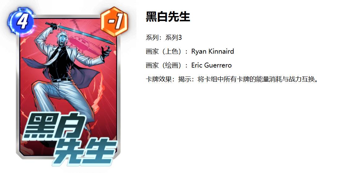 在《漫威终极逆转》中,负先生卡牌效果是“揭示:将卡组中所有卡牌的能量消耗与战力互换”,这一独特的能力为玩家提供了一种新颖的战术选择。我们在构建以负先生为核心的卡组时,需要考虑到他的技能对卡组构建的影响。由于他的技能会交换所有卡牌的能量消耗和战力,因此构建卡组时,我们需要精心挑选那些在交换后能够带来战术优势的卡牌。例如,选择那些原本战力较高但能量消耗较低的卡牌,通过负先生的技能,这些卡牌可以在不消耗太多能量的情况下发挥更大的作用。在玩法上,负先生卡组可能需要在尽快使用负先生的揭示技能,以达到最佳效果。下面给大家介绍一套3池版本新手向的的负先生卡组
