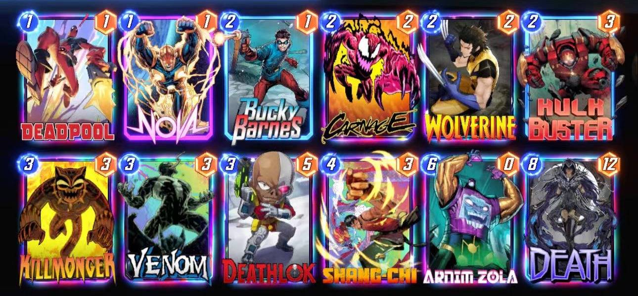# (1) Deadpool# (1) Nova# (2) Bucky Barnes# (2) Carnage# (2) Wolverine# (2) Hulkbuster# (3) Killmonger# (3) Venom# (3) Deathlok# (4) Shang-Chi# (6) Arnim Zola# (8) Death#eyJDYXJkcyI6W3siQ2FyZERlZklkIjoiRGVhZHBvb2wifSx7IkNhcmREZWZJZCI6Ik5vdmEifSx7IkNhcmREZWZJZCI6IkJ1Y2t5QmFybmVzIn0seyJDYXJkRGVmSWQiOiJDYXJuYWdlIn0seyJDYXJkRGVmSWQiOiJXb2x2ZXJpbmUifSx7IkNhcmREZWZJZCI6Ikh1bGtidXN0ZXIifSx7IkNhcmREZWZJZCI6IktpbGxtb25nZXIifSx7IkNhcmREZWZJZCI6IlZlbm9tIn0seyJDYXJkRGVmSWQiOiJEZWF0aGxvayJ9LHsiQ2FyZERlZklkIjoiU2hhbmdDaGkifSx7IkNhcmREZWZJZCI6IkFybmltWm9sYSJ9LHsiQ2FyZERlZklkIjoiRGVhdGgifV19## To use this deck, copy it to your clipboard and paste it from the deck editing menu in Snap.