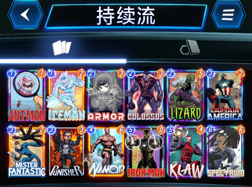 本次给大家带来了《漫威终极逆转》持续流卡组搭配推荐,持续流卡组主要依赖于具有持续效果的卡牌来控制游戏节奏和地点的争夺。核心卡牌:美国队长、纳摩、钢铁侠、克劳、光谱。这套卡组曲线比较平滑,基本可以按费拍怪有啥拍啥,可以通过钢力士、神奇先生和克劳拿下一些阴间地形。打出纳摩和克劳前尽量提前规划好要赢得哪两个区域。第六回合算好点数打出光谱,拿下比赛。
