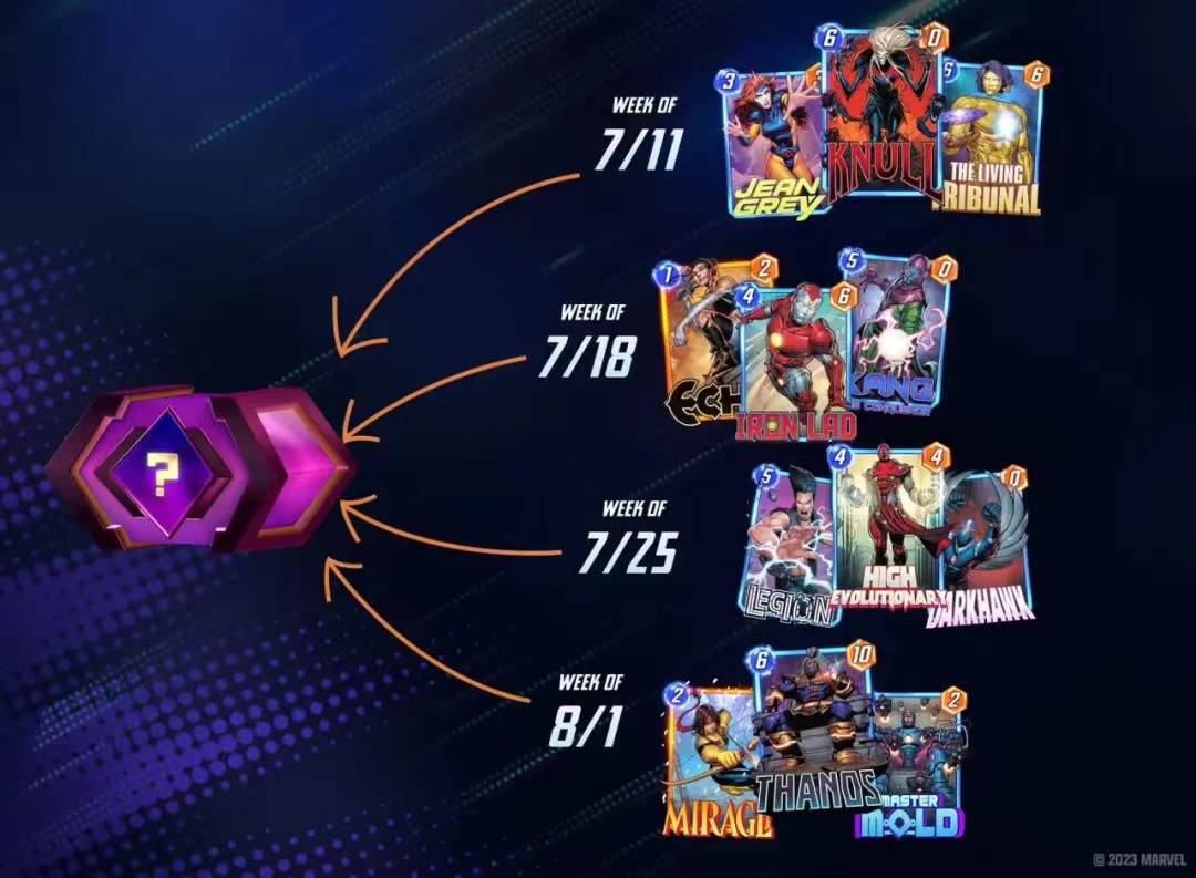 卡池根据收藏等级,漫威终极逆转卡牌被划分为三个池子,214级以前可以开出1池卡(官方称为系列1),222-474级可以开出2池卡,486级以上可以开出3池卡。