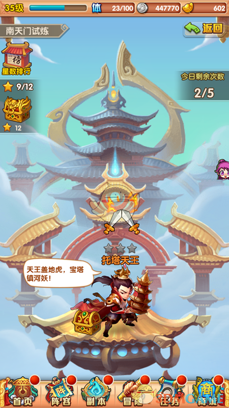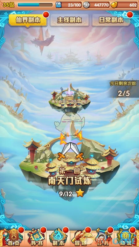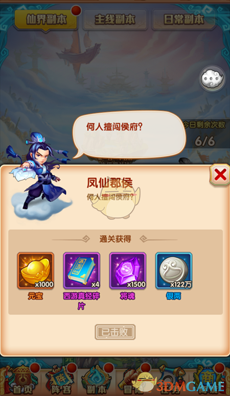 首次通关【仙界】,可领取通关宝箱,内含宝物精炼石、银两以及元宝,之后再次攻打该关卡则可获得将魂。每天有5次攻打的机会,但是每个关卡每天只能攻打1次。
