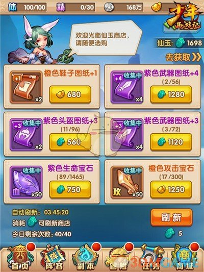 主线副本和九重天是宝石和图纸的主要来源,在仙玉商店购买也可以快速的获取。