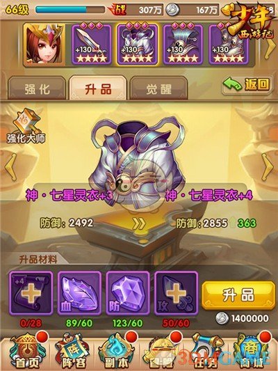 消耗银币可以小幅度提升装备基础属性,提升到限定等级后,需要对装备进行“升品”(提升颜色品质)。