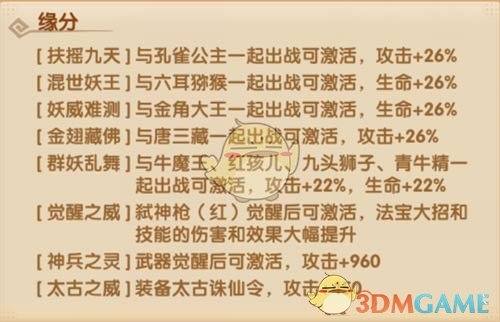 群妖乱舞:与牛魔王、红孩儿、九头狮子、青牛精一起出战可激活,攻击+22%,生命+22%