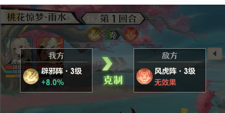 敌方使用的阵法为风虎阵,主加伤害,建议根据自身情况选择重甲、雁行克制,重甲提升防御,提升队伍存活能力,雁行阵提升速度,让我方能更快出手。如果这两个阵法等级较低,或是缺少输出提升,也可以根据情况调整为小克制的叶隐阵和辟邪阵。
