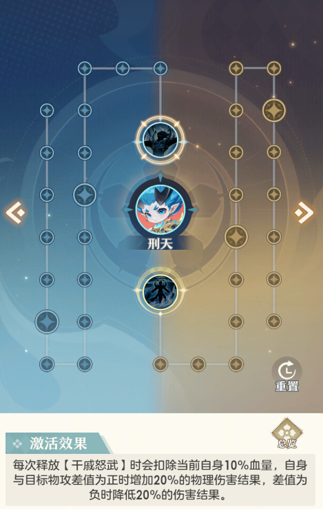 左边技能可以进一步激发刑天的烧血增伤能力,同时也能大大提高刑天的物理伤害效果,但缺陷也较为明显,当刑天的物攻低于目标物攻时,也会使自身的伤害结果降低较多。右边技能可以使增防减伤效果和反击概率提升。因此推荐先点亮右边识海技能,再点左边识海技能。