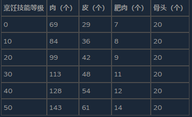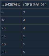从这些表格中我们可以看到,新手制作的菜肴数量是专业厨师的三分之一。总的来说,如果你已采摘了所有浆果和蘑菇,捕捞了所有鱼类,却依然缺乏食物,其中一个原因就是厨师技能不足,导致百分之六十六的食材被白白浪费掉了。
