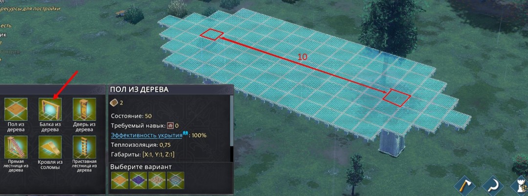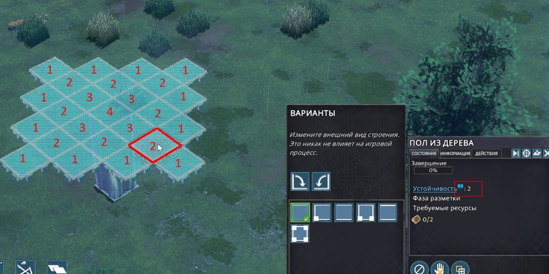您可以在模态窗口中查看稳定性参数,只需先点击建筑即可看到详细数据。如果稳定性为 0,您将无法在该处建造任何东西,系统会阻止不安全的施工。与屋顶类似,横梁可将墙体连接起来,墙与墙之间的最大距离可达 10 格,从而为天花板以及位于该横梁上的墙体提供 4 级的稳定性支持。