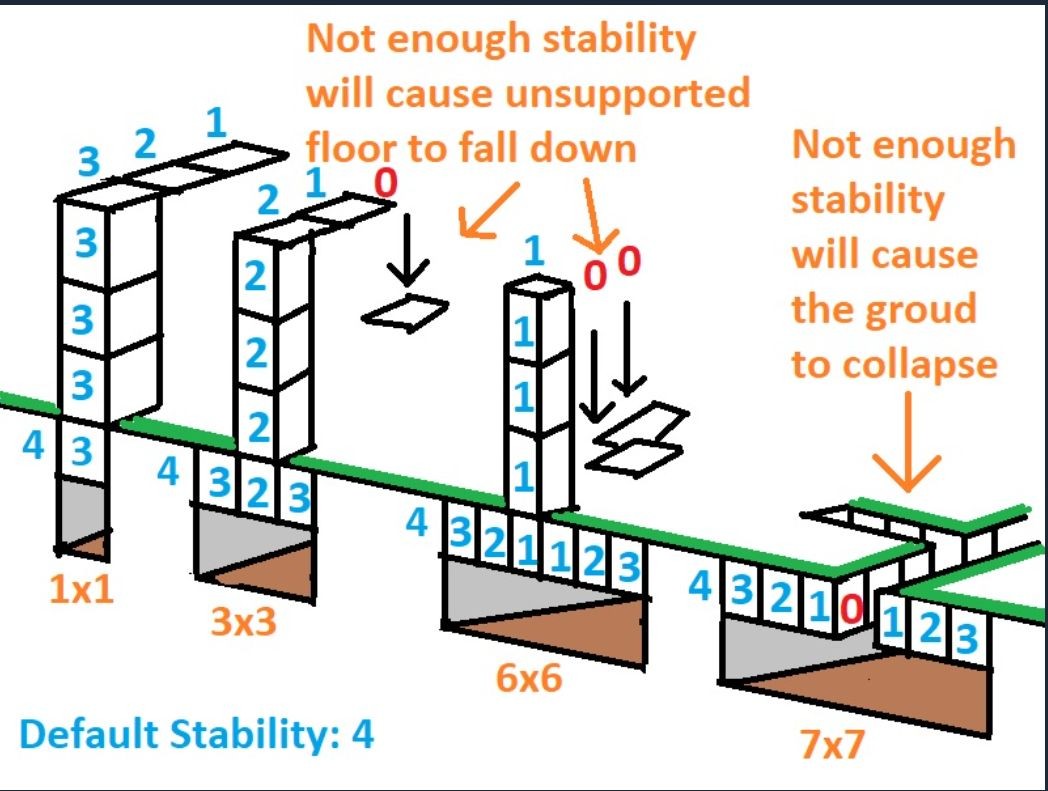 因此,如果您在承重结构下方挖洞,墙体和地板可能会坍塌。为避免这种情况发生,请使用横梁进行加固。横梁同样也可安装在土墙上,为玩家提供多样的建筑选择。带有稳定性数字的伞状图是帮助您理解和设计建筑的基础,直观展示受力范围。