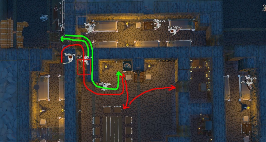 在基地内部,路线也应尽量精简。例如,我们知道角色醒来后会去取食物,然后坐到桌旁,寻找娱乐活动,之后再进行祈祷,当然也可能按其他顺序进行。路线及其长度至关重要。又比如,我们了解到厨师先去仓库取整只动物,将其宰杀,然后把肉运回仓库;接着,他再次前往仓库取肉,放入篝火中烹煮;随后,他再去仓库取木材,这才开始正式烹饪,最后再将做好的食物送回仓库。通过提高效率,所有这些路径都可以缩短。以下是布局示例。