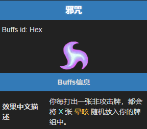 关于效果机制,拥有邪咒状态时,每当玩家打出一张非攻击牌,就会将等同于邪咒层数的晕眩牌洗入抽牌堆,这一机制直接影响了玩家的抽牌运气和回合操作空间。