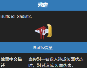 该状态类型为玩家 BUFF,且来源唯一。其特性为可叠加,层数越高,每次施加 Debuff 时造成的伤害越多。理解其效果机制至关重要。拥有残虐状态时,每当玩家对敌人施加负面状态,即 Debuff,就会对目标造成等同于残虐层数的伤害。需要注意的是,只有施加 Debuff 时才会触发残虐效果。若敌人已拥有该 Debuff,再次施加,如叠毒、延续虚弱,仍会触发伤害。当面对多个敌人时,每个受到 Debuff 施加的敌人都独立触发伤害。