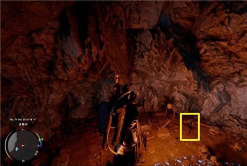 进入洞口,沿着唯一的路前进,同时注意左手边的岩壁下方,直到路稍微变宽,左手边看到两具靠在墙边的骸骨,在骸骨旁边就能找到插在地上的安图布拉之眼。注意此时见到建议立刻拾取,否则可能会遇到武器消失的 BUG。