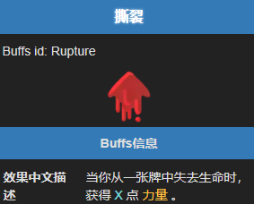 拥有撕裂状态时,每当玩家因卡牌效果失去生命,就会获得等同于撕裂层数的力量加成。