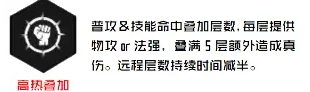 高热叠加:普攻、技能命中敌方英雄(跳一次伤害就算命中一次比如多段伤害的技能,多段伤害的普攻)会叠加攻击or法强,持续5秒(远程英雄持续时间减半),最多叠加5层,叠加5层之后额外造成10%的真实伤害。