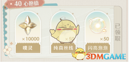 1、心愿值40:噗灵*10000、纯真丝线*50、闪亮泡泡*50。