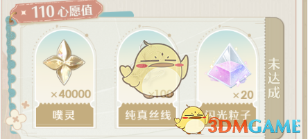 3、心愿值110:噗灵*40000、纯真丝线*100、闪光粒子*20。