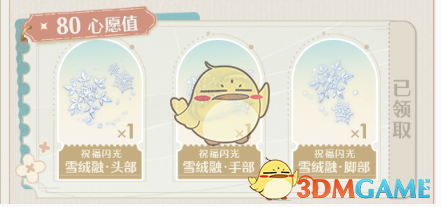 2、心愿值80:雪绒融·头部*1、雪绒融·手部*1、雪绒融·脚部*1(祝福闪光)。
