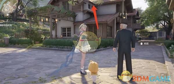 与树下戴着黑色礼帽的NPC对话后开启。 前往图中箭头方向的屋顶取得「日记本」后回来对话即可完成。