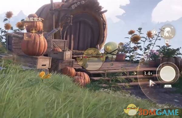 与晒晒对话,利用错位拍摄一张用南瓜组成的雪人照片,位置如图所示,拍好后交给晒晒即可。