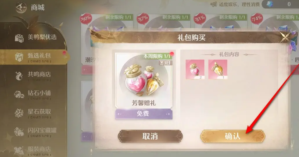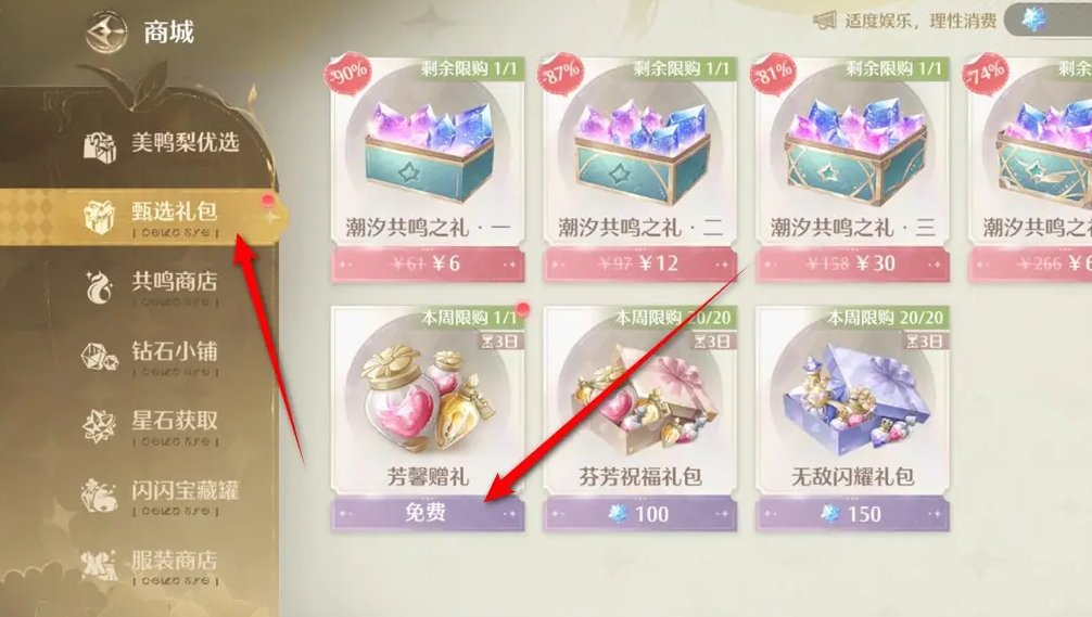 2、点选“甄选礼始掩够包”页面,点击“免费”芳馨赠礼。