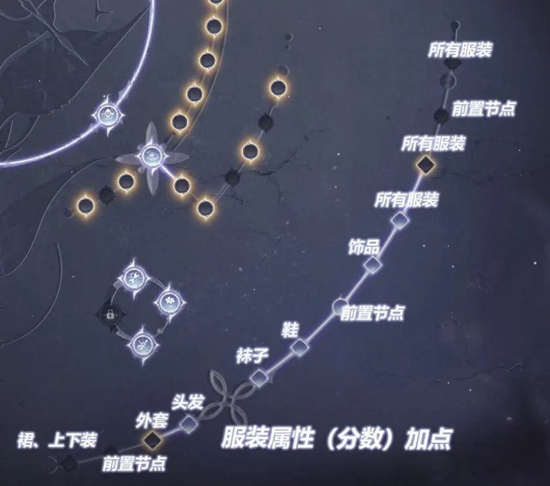 二阶段:继续均衡加点,解锁前置节点后,优先提升裙装、上下装和饰品的能力。