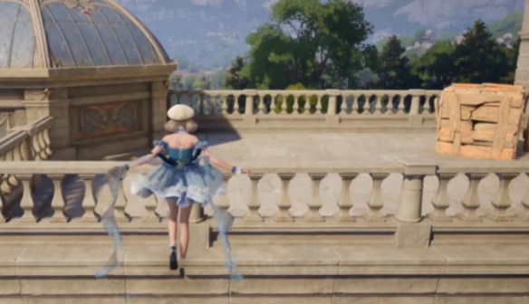 跳到伞上触发一下,然后我们跳到栏杆下面,就能看到墙上的标志。