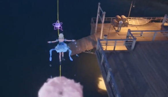 跳到伞上触发一下,然后我们跳到栏杆下面,就能看到墙上的标志。