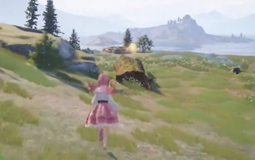 视角向东北方向转,可以看到山坡上有一个魔方。